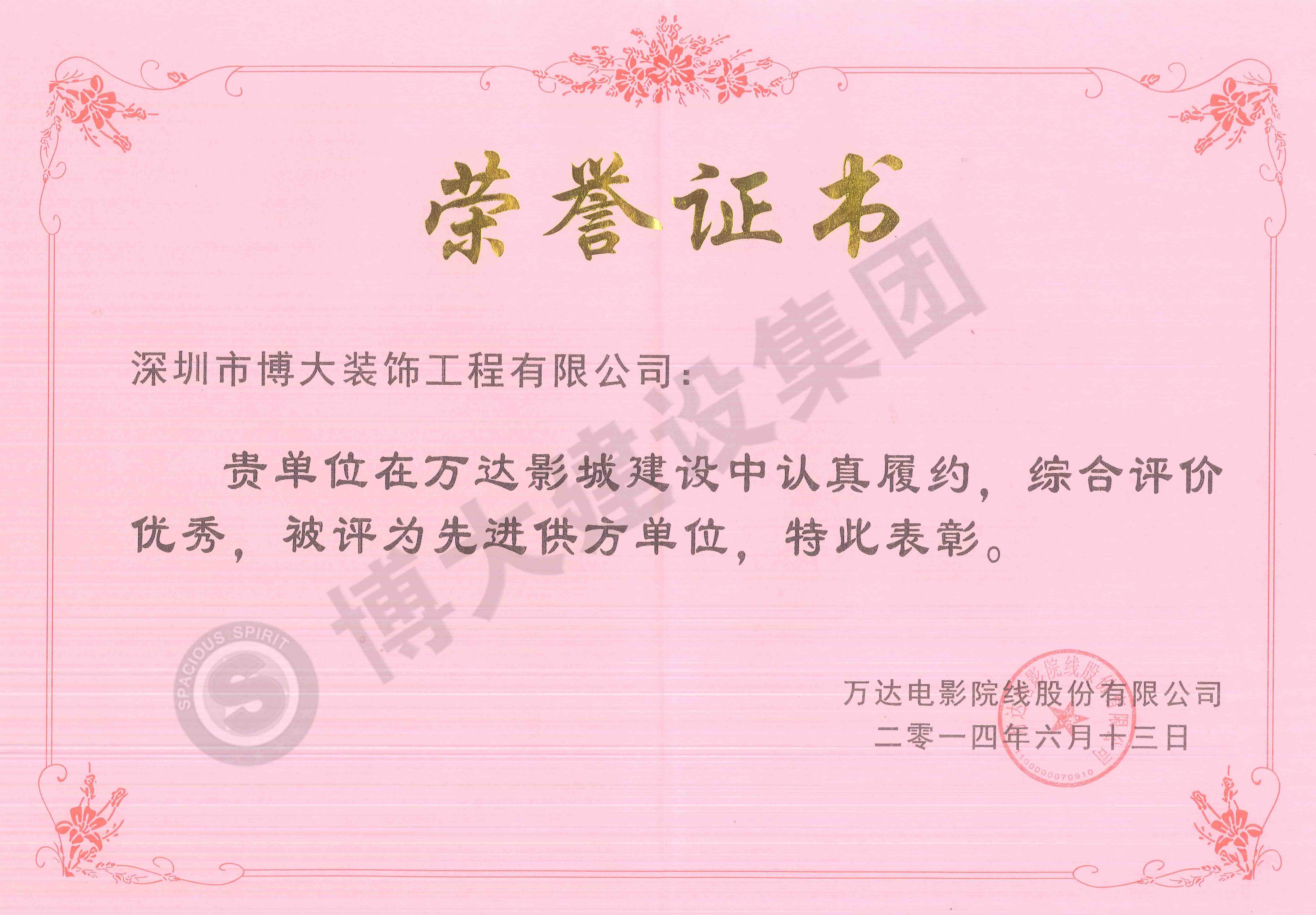 榮獲萬達影城先進供方單位